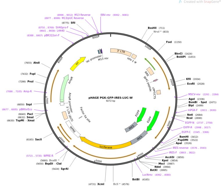 质粒名称:pHAGE PGK-GFP-IRES-LUC-W